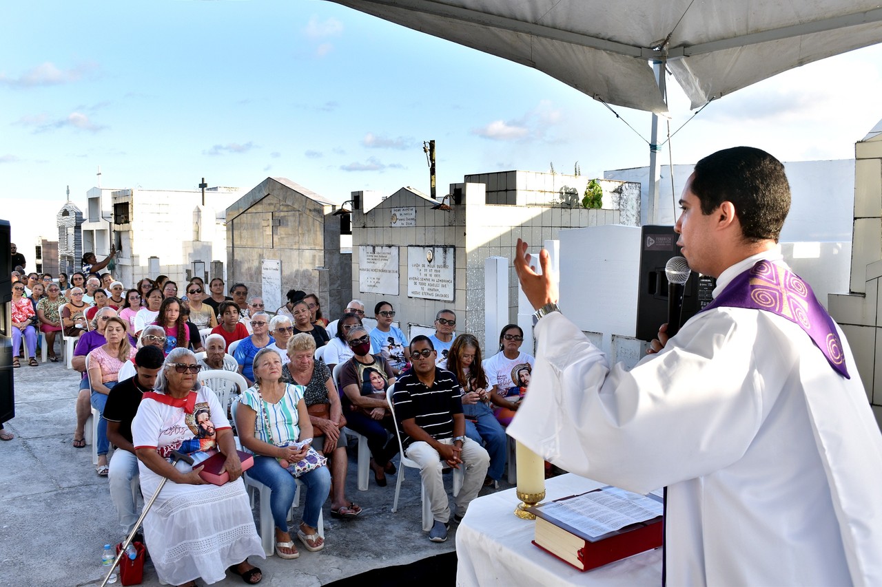 O Dia de Finados – data em que, no catolicismo, celebra-se o Dia dos Fiéis Defuntos – foi marcado por fé, emoção e homenagens no Cemitério de São José, no Centro do Cabo. Mais de 100 de fiéis participaram da tradicional missa em memória dos fiéis defuntos, realizada no fim da tarde deste domingo (2), presidida pelos padres Severino e Everton, que conduziram um momento de reflexão e esperança.
