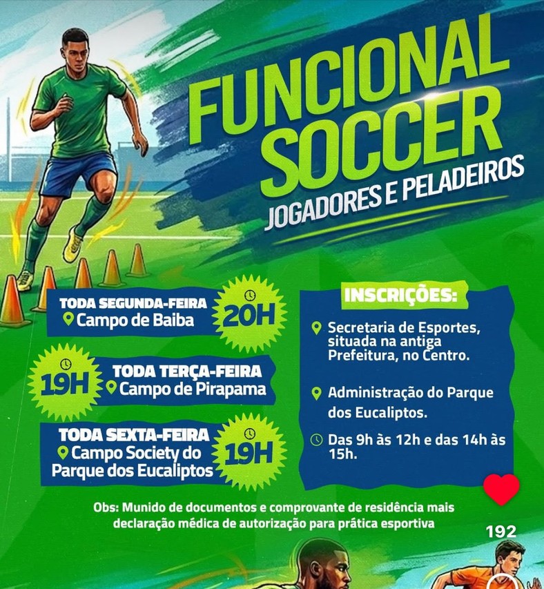 O Campo da Baiba será o palco da primeira edição do Funcional Soccer, que estreia nesta segunda-feira (19), às 20h. A atividade, criada pela Secretaria de Juventude e Esportes, é voltada exclusivamente para jogadores e peladeiros. Serão oferecidas de 20 a 30 vagas, e os amantes do futebol que tiverem interesse em participar dos treinos devem realizar a inscrição.