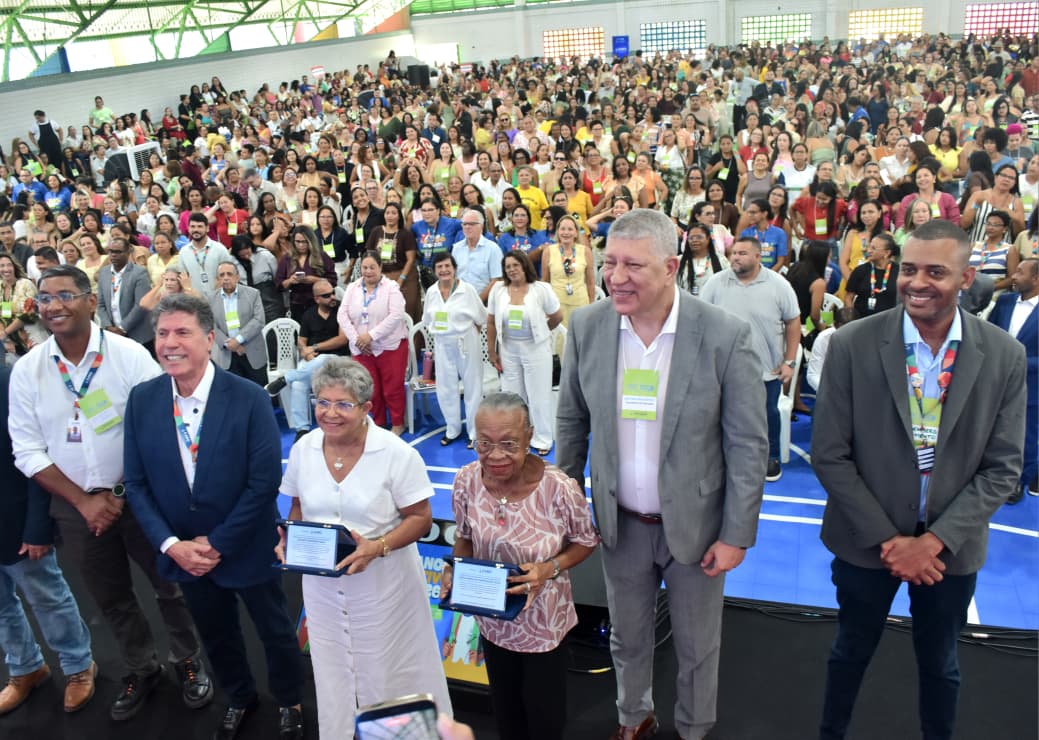 HOMENAGEM – Durante o evento, a Secretaria Municipal de Educação realizou uma homenagem à profissional do Ano Letivo de 2026, Ruizeny Monteiro Viana, coordenadora de Fluxo de Pessoal da pasta. Na ocasião, foi exibido um vídeo destacando sua trajetória e contribuição para a educação do Cabo de Santo Agostinho. Ruizeny também recebeu uma placa em reconhecimento ao seu trabalho, assim como Nádia da Purificação, profissional homenageada do Ano Letivo de 2025.